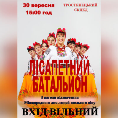 30 вересня у Тростянецькому Центрі культури та дозвілля відбудеться святковий захід з нагоди Міжнародного дня людей похилого віку. Початок – о 15:00. Про це повідомляють на сторінці Центру. Для гостей свята виступить яскравий український гурт «Лісапетний батальйон», який подарує присутнім гарний настрій, енергію та позитивні емоції. Організатори запрошують усіх жителів громади долучитися до свята та […]