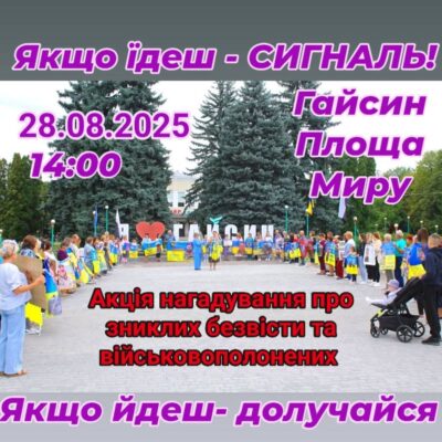 28 серпня 2025 року о 14:00 на площі Миру в Гайсині відбудеться мирна акція-нагадування про українських військовополонених та всіх громадян, зниклих безвісти за особливих обставин. Організаторами заходу виступають родини військовополонених, зниклих безвісти, а також Всеукраїнське громадське об’єднання «Матерів і дружин Захисників України» у Вінницькій області. Акція має на меті привернути увагу суспільства та світової спільноти […]