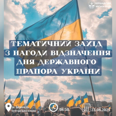Бершадська громада запрошує всіх мешканців приєднатися до святкування Дня Державного Прапора України. Дата: 23 серпня 2025 рокуЧас: 8:50Місце: Центральна площа міста Бершадь Програма заходу: Організатори закликають усіх долучитися, щоб разом віддати шану символам держави та Героям, які боролися і борються за її незалежність.