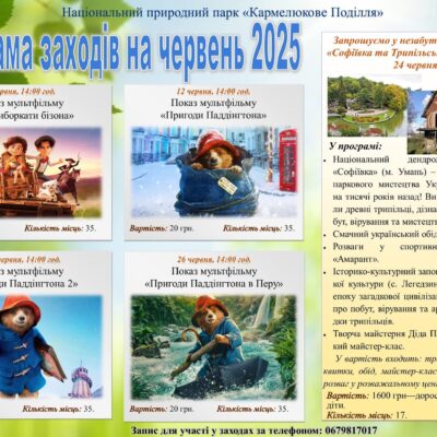 Національний природний парк «Кармелюкове Поділля» підготував насичену програму заходів на червень 2025 року для дітей і родинного дозвілля. Щосереди о 14:00 у приміщенні парку відбуватимуться покази популярних мультфільмів. Вартість перегляду — 20 грн, кількість місць обмежена — 35 осіб. У програмі: Окрім кінопоказів, 24 червня парк організовує захопливу одноденну поїздку до Умані та Легедзиного: «Софіївка […]