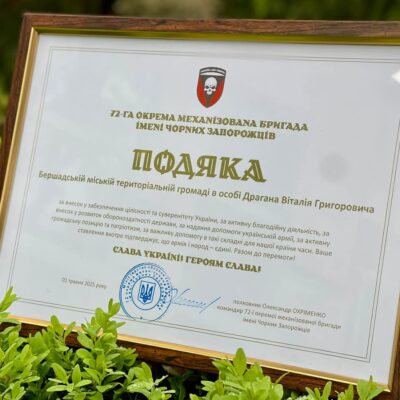 Бершадська громада отримала відзнаку — Подяку від 72-ї окремої механізованої бригади імені Чорних Запорожців. Цей лист передав земляк, командир бригади та полковник Олександр Охріменко. Про це на своїй сторінці у фейсбуці повідомив міський голова Бершаді Віталій Драган. У листі висловлюється вдячність за постійну підтримку громади, активну участь у допомозі фронту, а також за громадянську позицію […]