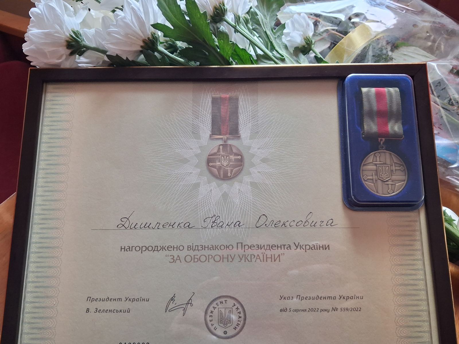 Жителя Теплицької громади, військовослужбовця Івана Дишленка, який вважається зниклим безвісти під час виконання військових обов’язків, вшанували відзнакою Президента України «За оборону України». Вручили нагороду його дружині – Катерині Михайлівні. Про це повідомляє Теплицька селищна рада.