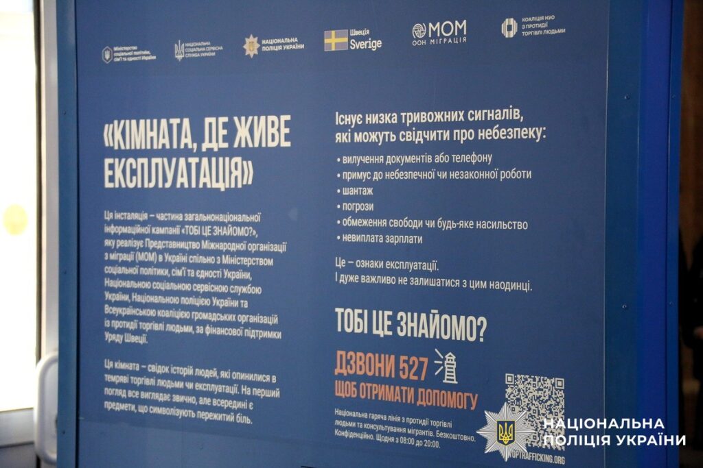 У Вінниці на території залізничного вокзалу відкрили інтерактивну інсталяцію «Кімната, де живе експлуатація», покликану привернути увагу до проблеми торгівлі людьми. Проєкт реалізовано в межах інформаційної кампанії «Тобі це знайомо?», яка має на меті попередити українців про ризики трудової та інших форм експлуатації.