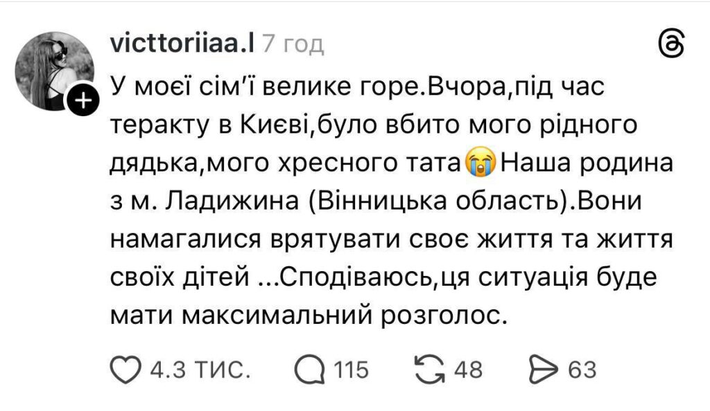Про трагедію повідомила племінниця загиблого у соціальній мережі Threads.