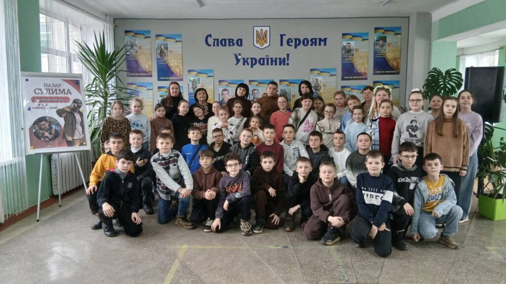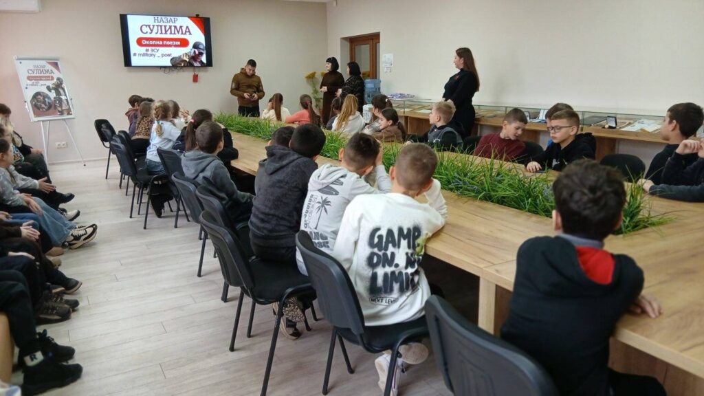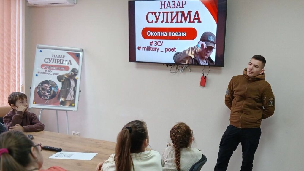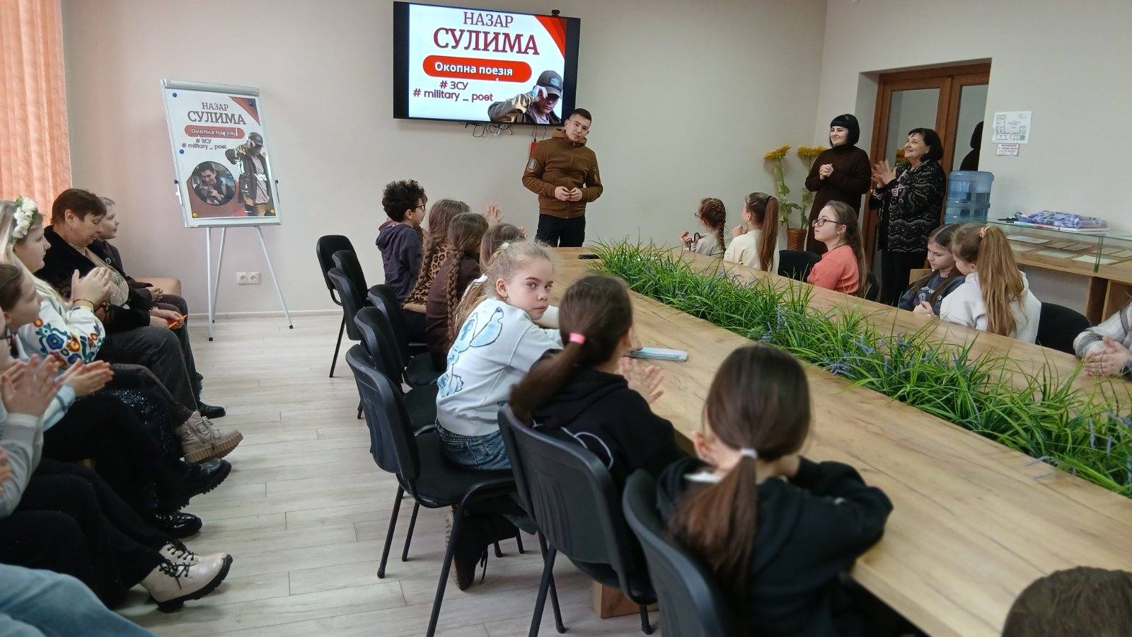 Тема спілкування — «Окопна поезія». Діти мали унікальну можливість почути авторські вірші, народжені в реаліях війни, — рядки, у яких поєдналися біль і віра, тривога і незламність. Поезія, створена на передовій, стала для школярів живим свідченням сили українського духу та слова, що підтримує і надихає навіть у найскладніші часи.
