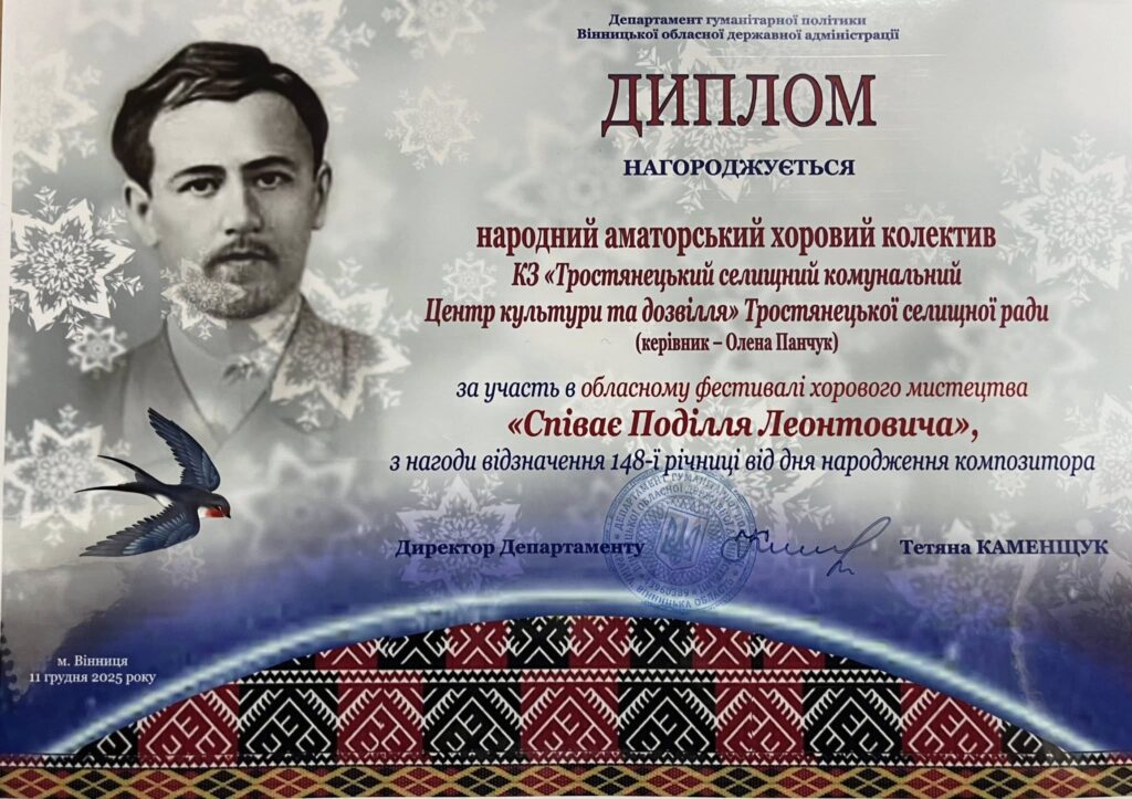 Народний аматорський хоровий колектив Тростянецького селищного комунального центру культури та дозвілля під керівництвом Олени Панчук гідно представив Тростянецьку громаду на престижному фестивалі хорового мистецтва «Співає Поділля Леонтовича», що відбувся 11 грудня 2025 року у Вінниці, у Фаховому коледжі мистецтв ім. Миколи Леонтовича.