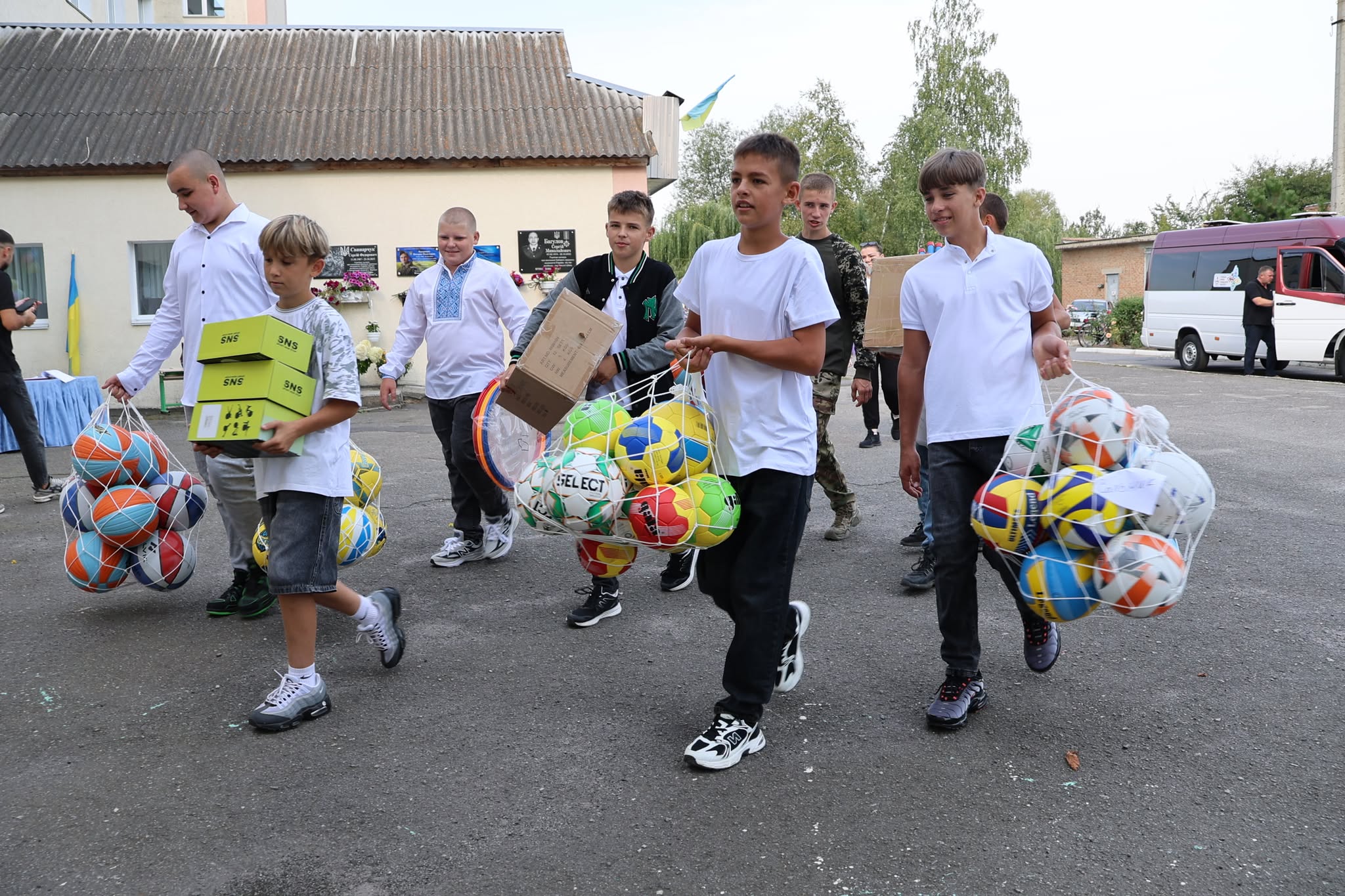 Під час урочистої лінійки благодійники передали школі необхідне обладнання для занять спортом. Одразу після вручення діти з радістю випробували м’ячі та інший інвентар, перетворивши спортзал на простір сміху й енергії.