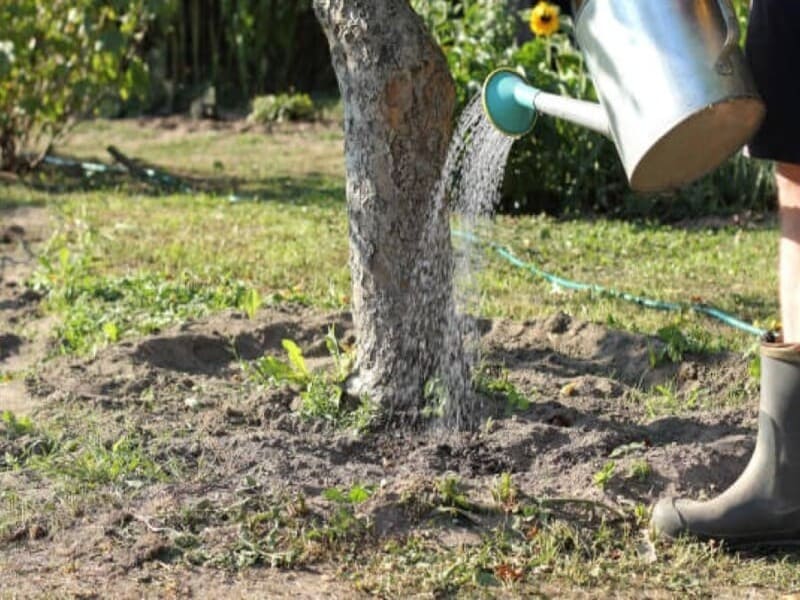 Вологозарядковий полив – один з найважливіших етапів осіннього догляду. Ґрунт краще зберігатиме тепло і менше промерзне. Коріння отримає необхідну вологу для весняного росту. А також знизиться ризик підмерзання дерева. Поливайте наприкінці жовтня – на початку листопада, до замерзання ґрунту. На одне доросле дерево – 4–5 відер води, рівномірно по колу стовбура.