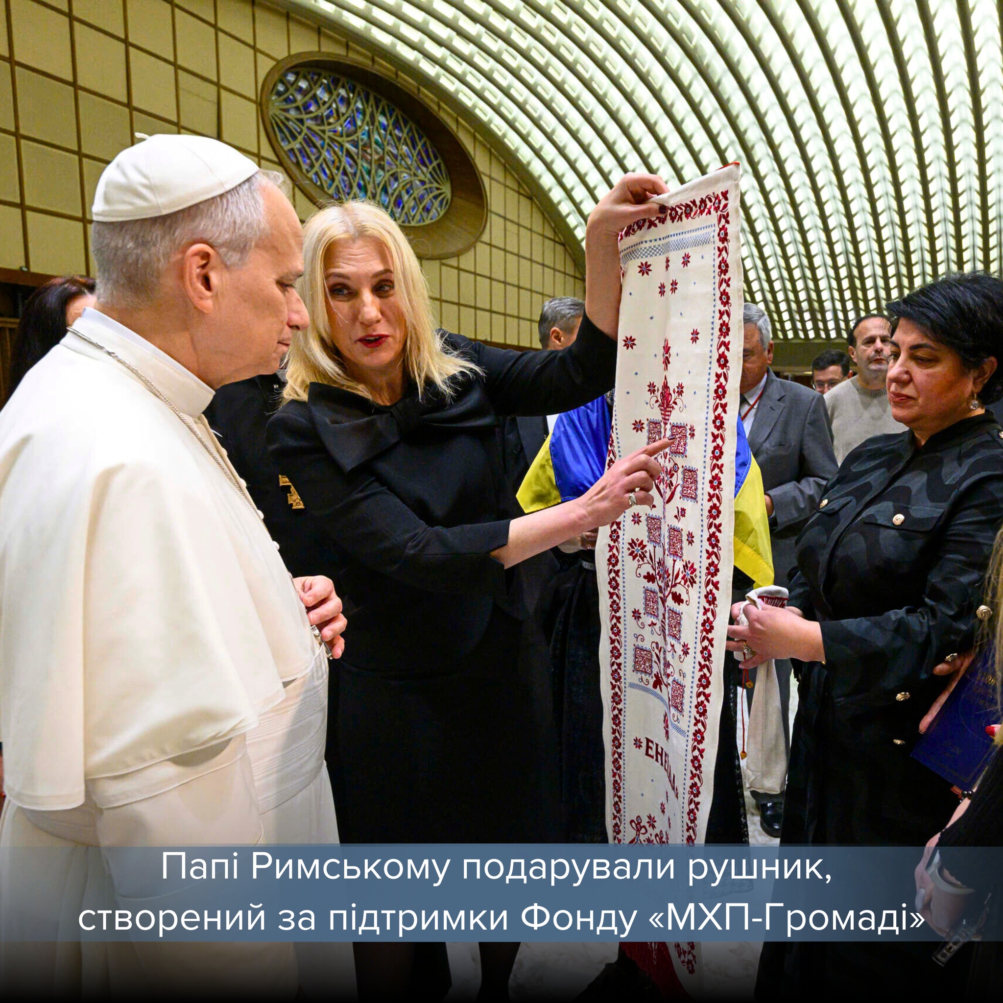 Під час візиту до Ватикану представниці Міжнародного жіночого руху «За сімейні цінності» подякували Папі за його підтримку України та передали унікальний гастрономічний рушник, який створили разом із Благодійним фондом «МХП-Громаді».
