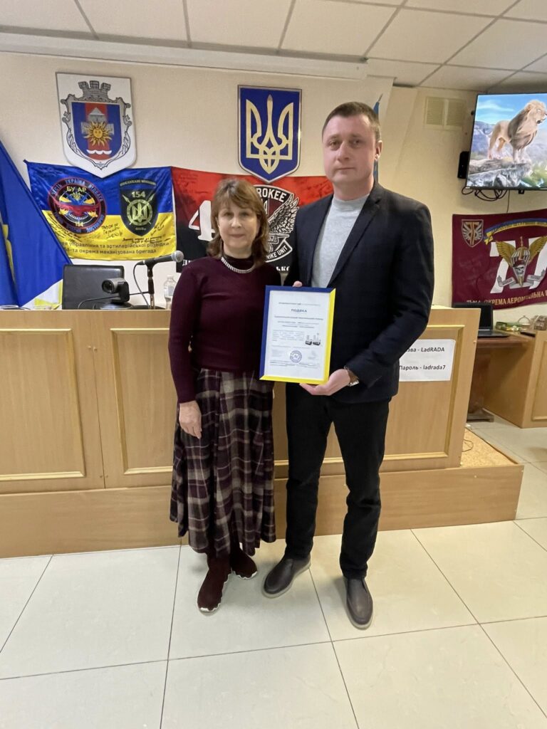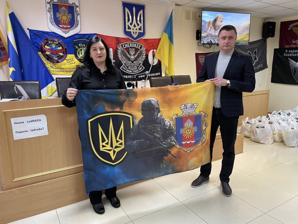 Голова ГО «Відкритий простір громадського розвитку» Альона Фадієвська вручила прапори, подяки та сувеніри від військових частин як знак вдячності Ладижинській громаді за постійну підтримку українських захисників.