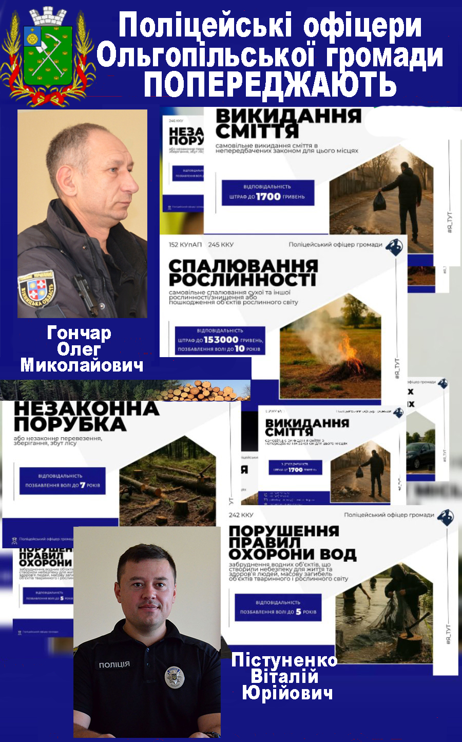 Поліцейські офіцери Ольгопільської територіальної громади Олег Гончар та Віталій Пістуненко вкотре інформують жителів про відповідальність за порушення екологічного законодавства та нагадують про найпоширеніші правопорушення, які фіксуються на території населених пунктів Ольгопільської сільської територіальної громади.