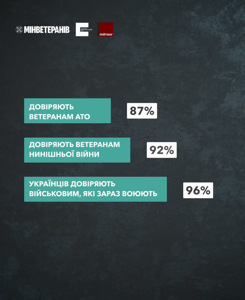 Згідно з результатами опитування, рівень довіри українців до військових і ветеранів залишається надзвичайно високим. 96% респондентів довіряють військовослужбовцям, які нині перебувають на фронті, 92% — ветеранам повномасштабної війни, а 87% — ветеранам АТО. Це свідчить про стабільно високий авторитет захисників України в суспільстві.