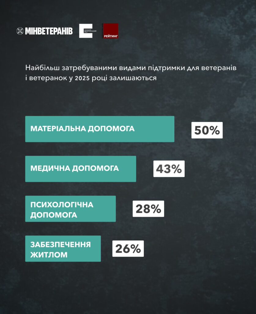 Водночас результати дослідження чітко окреслюють ключові потреби ветеранської спільноти. Найбільш актуальними залишаються матеріальна підтримка, доступ до якісної медичної допомоги, включно з реабілітацією та психологічною підтримкою. Ці запити, за словами фахівців, мають стати пріоритетними при формуванні державної ветеранської політики у найближчі роки.