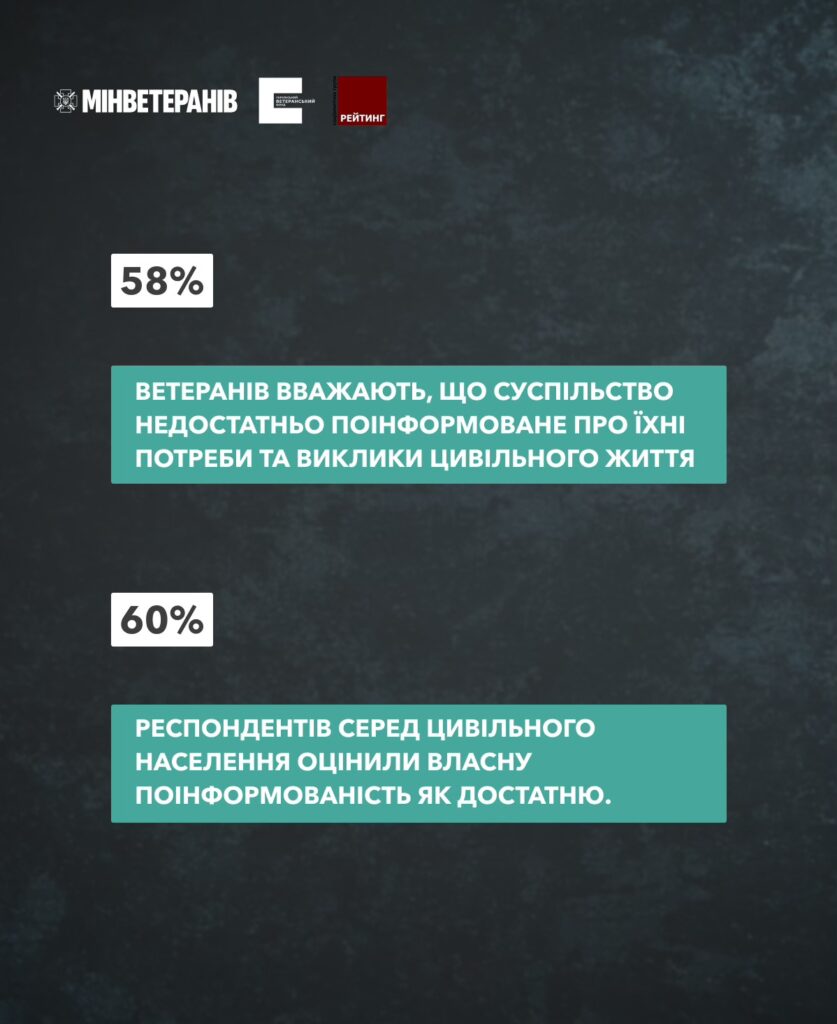Водночас самі ветерани оцінюють ситуацію більш стримано. Лише 60% ветеранів вважають, що суспільство сьогодні поважає їх, тоді як 36% дотримуються протилежної думки. Дослідники наголошують: між суспільним образом ветеранів і їхнім власним відчуттям існує певний розрив. Утім, він має природний характер і наразі не переростає у соціальний конфлікт.