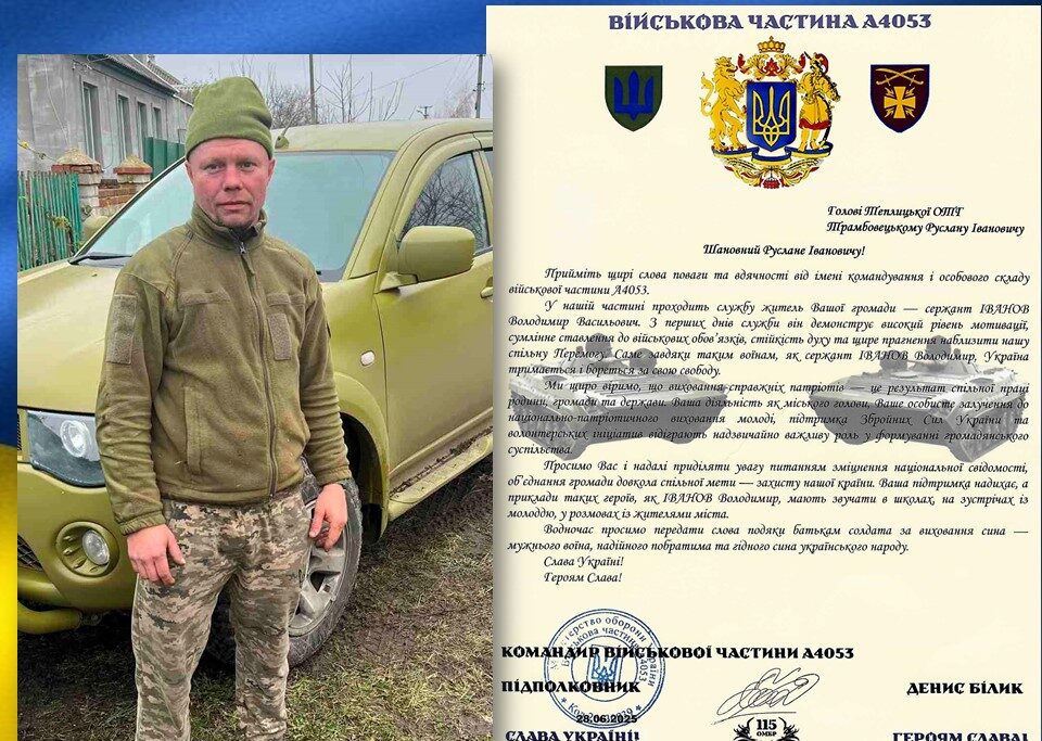 На адресу Теплицької селищної ради надійшов лист подяки від командування військової частини А4053. У документі висловлено вдячність жителю селища Теплик, сержанту Володимиру Васильовичу Іванову за сумлінне та чесне виконання військового обов’язку.