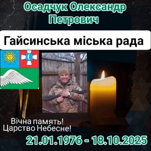 Сум і біль знову огорнули Гайсинську громаду. 18 жовтня 2025 року перестало битися серце захисника України — штаб-сержанта Олександра Осадчука, жителя села Тарасівка Чечелівського старостинського округу. Про це повідомляє Гайсинська міська рада. Олександр Петрович народився у 1976 році. У 2023-му він став до лав Збройних Сил України за мобілізацією, служив у 21-й окремій механізованій бригаді, […]