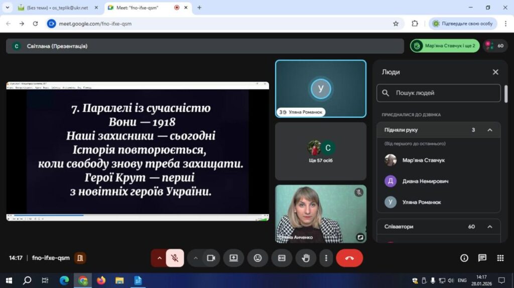 Під час онлайн-дискусії учасники обговорювали події 1918 року під Крутами, визначали, хто такі Герої Крут, у чому полягав їхній подвиг та яке значення ця історична подія має сьогодні, в умовах боротьби України за незалежність. Особлива увага була приділена ролі молоді у збереженні історичної пам’яті та формуванні активної громадянської позиції.