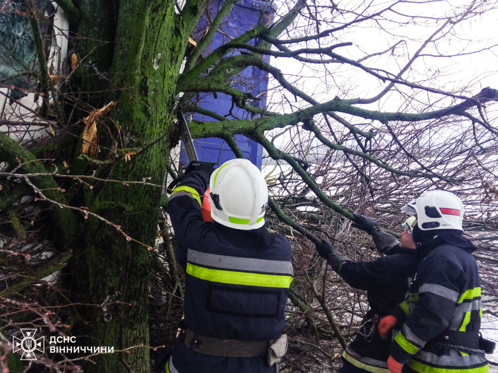 Виклик на лінію екстрених служб надійшов із Бершаді після того, як водій вантажного автомобіля не впорався з керуванням і здійснив наїзд на дерево. Причиною аварійної ситуації стали слизьке дорожнє покриття та обмежена видимість.