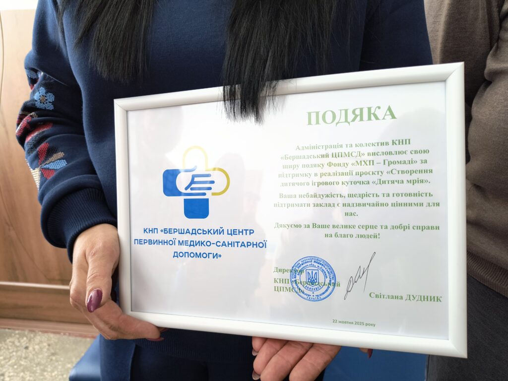 У Бершадському Центрі первинної медико-санітарної допомоги відкрили яскравий простір для малечі — ігровий куточок «Дитяча мрія». Ініціатива стала можливою завдяки підтримці Фонду «МХП-Громаді» та співфінансуванню Бершадської міської ради.