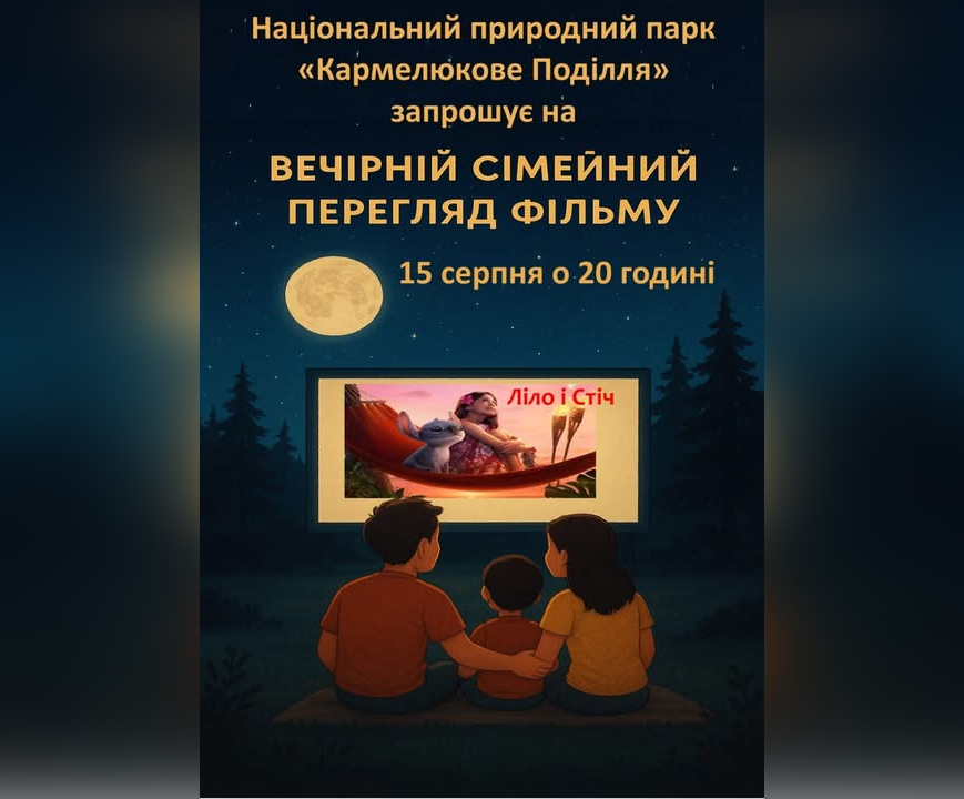 15 серпня на території адміністративної будівлі Національного природного парку «Кармелюкове Поділля» у смт Чечельник (вул. Свято-Михайлівська, 15) відбудеться відкритий показ мультфільму «Ліло і Стіч».
