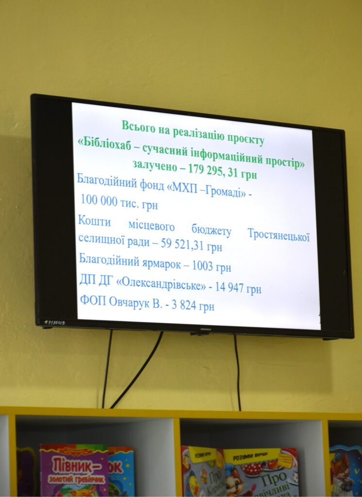 23 вересня в Олександрівському ліцеї відбулося урочисте відкриття «Бібліохабу — сучасного інформаційного простору», створеного в межах конкурсу «Час діяти, Україно!» від Благодійного фонду «МХП – Громаді» за підтримки селищного бюджету та спонсорів. Про це на своїй сторінці у фейсбуці повідомила Людмила Червонецька, голова Тростянецької селищної ради.