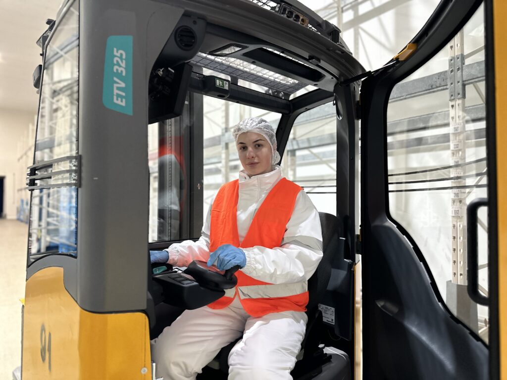 Сьогодні вона керує сучасною складською технікою, яка підіймає палети на висоту кількох поверхів. Це робота, що вимагає максимальної концентрації, точності та дотримання стандартів безпеки.