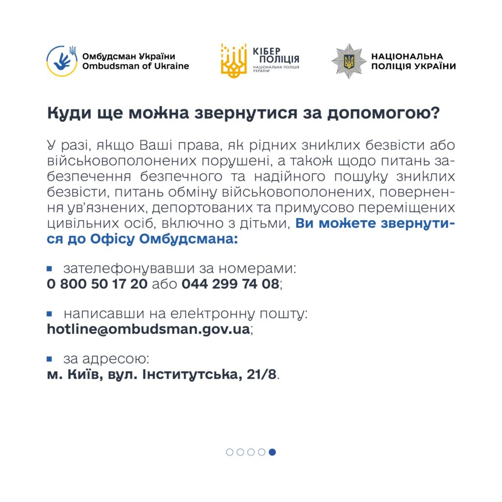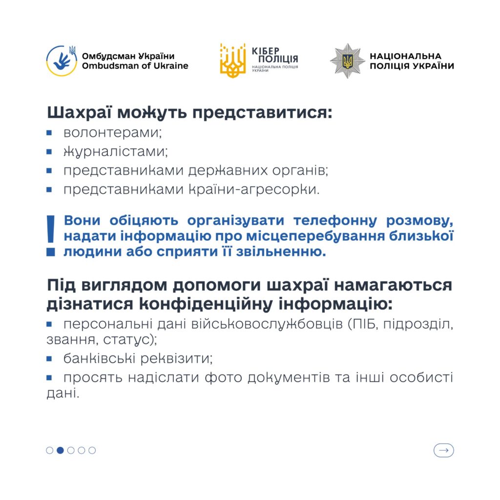 - не здійснювати жодних оплат «за допомогу» в питаннях полону чи розшуку;