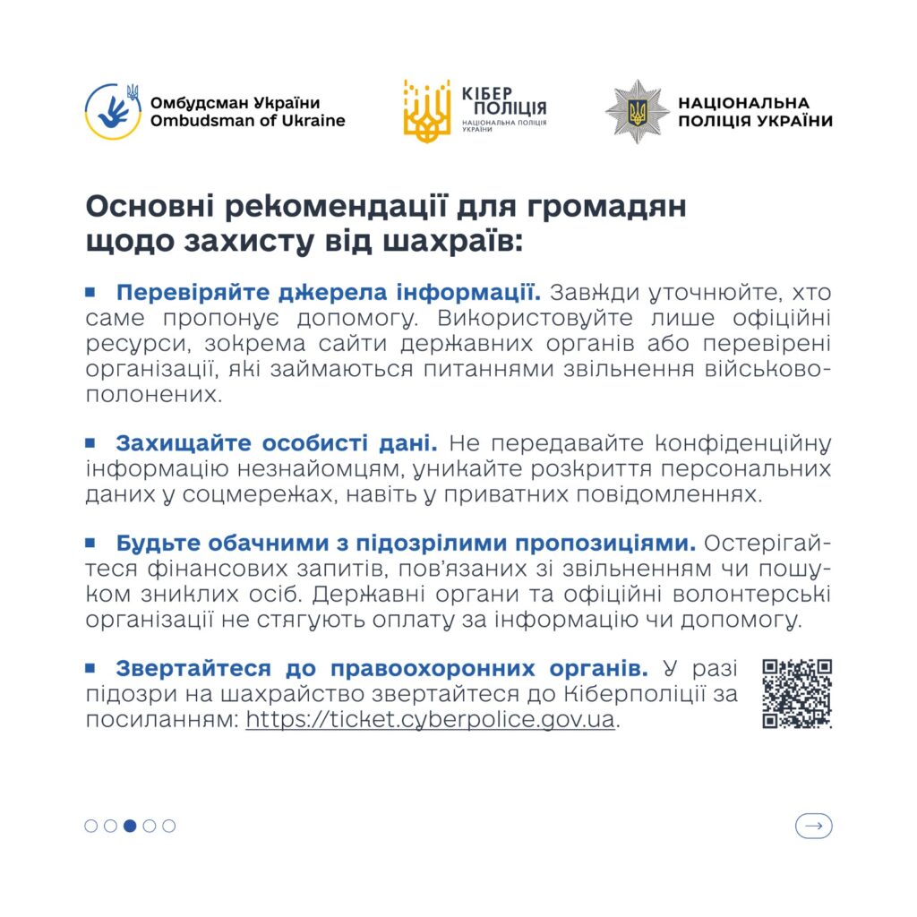 Жоден державний орган або офіційна установа не вимагає грошей і не збирає конфіденційні дані через приватні повідомлення. Будь-яка «допомога», що супроводжується тиском, таємничістю або фінансовими вимогами, є серйозним приводом для настороженості.