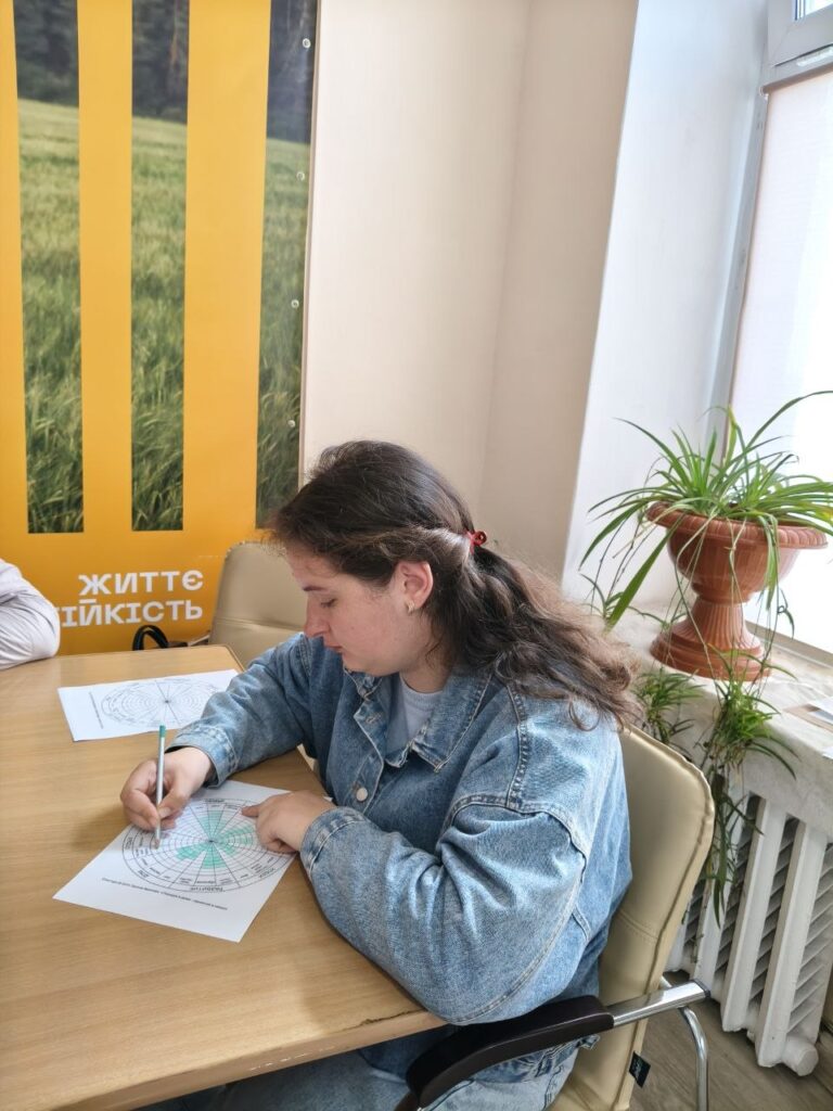 Цього разу учасниці присвятили час глибокій розмові із собою, працюючи з вправою «Колесо балансу». Така практика допомагає чесно оцінити власний життєвий стан, зрозуміти, які сфери потребують більшої уваги, а також знайти точки опори для подальшого руху вперед.