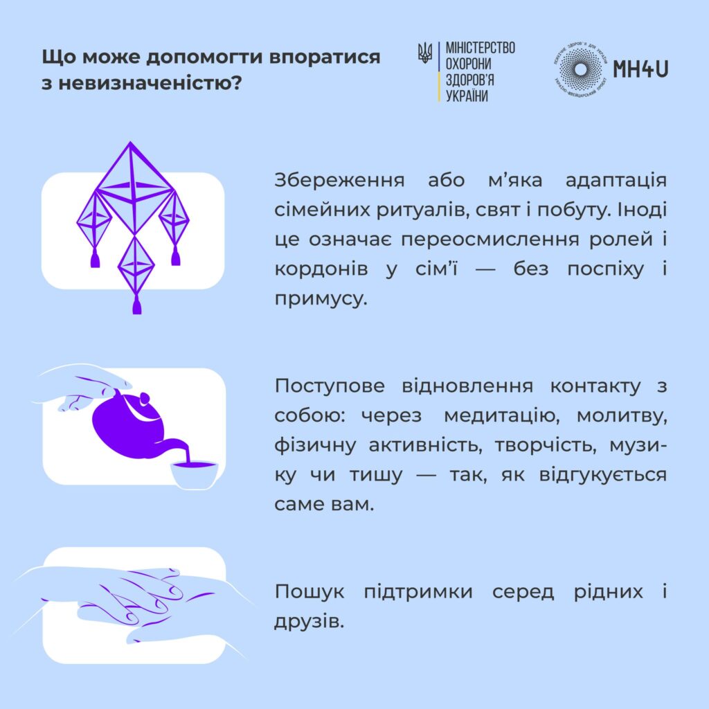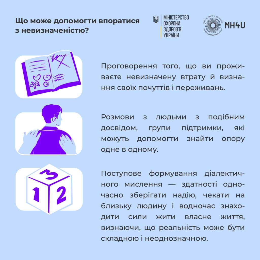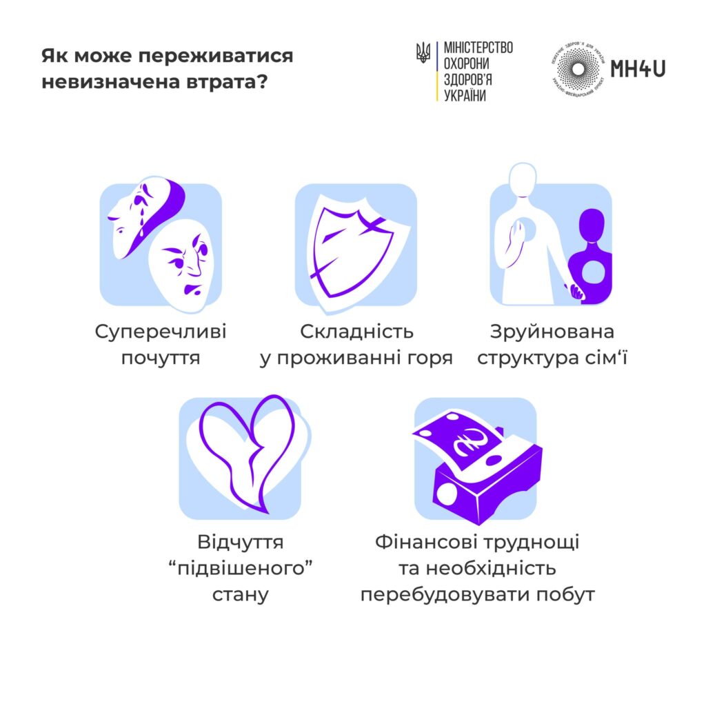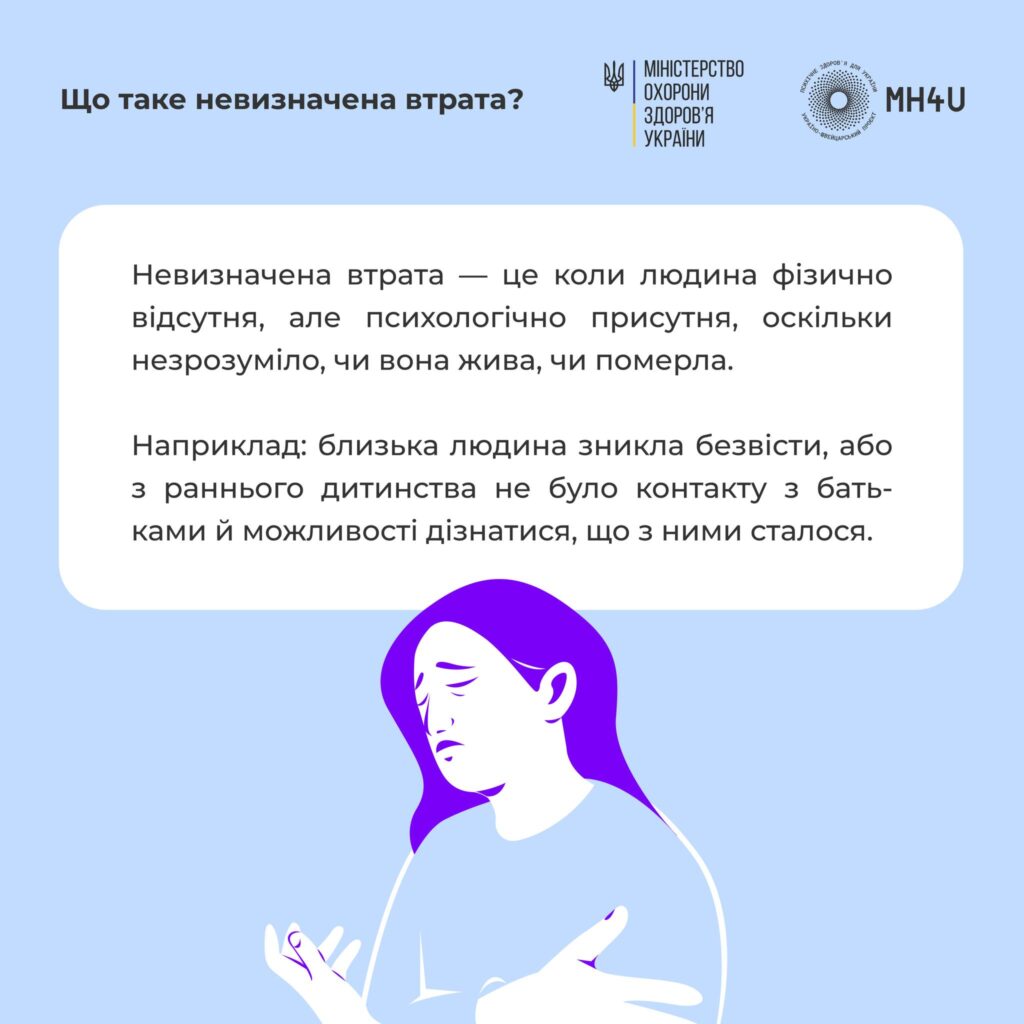 Міністерство охорони здоров’я України та ініціатива «Психічне здоров’я для України» пояснюють, що родини зниклих безвісти переживають так звану невизначену втрату. Жити у стані очікування надзвичайно складно: постійна тривога, неможливість спланувати життя, зміни настрою та фізичне виснаження — часті супутники цього стану.